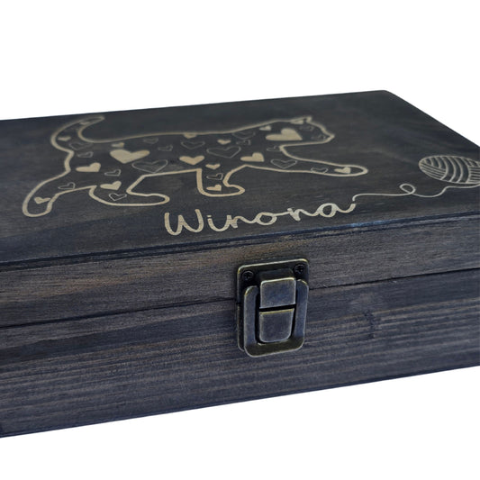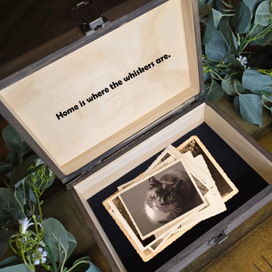 Our boxes are made from pine wood construction. They have a clasp on the front and are hinged on the back.