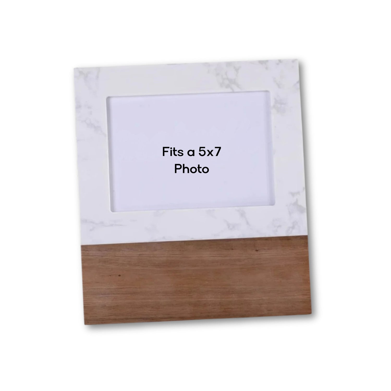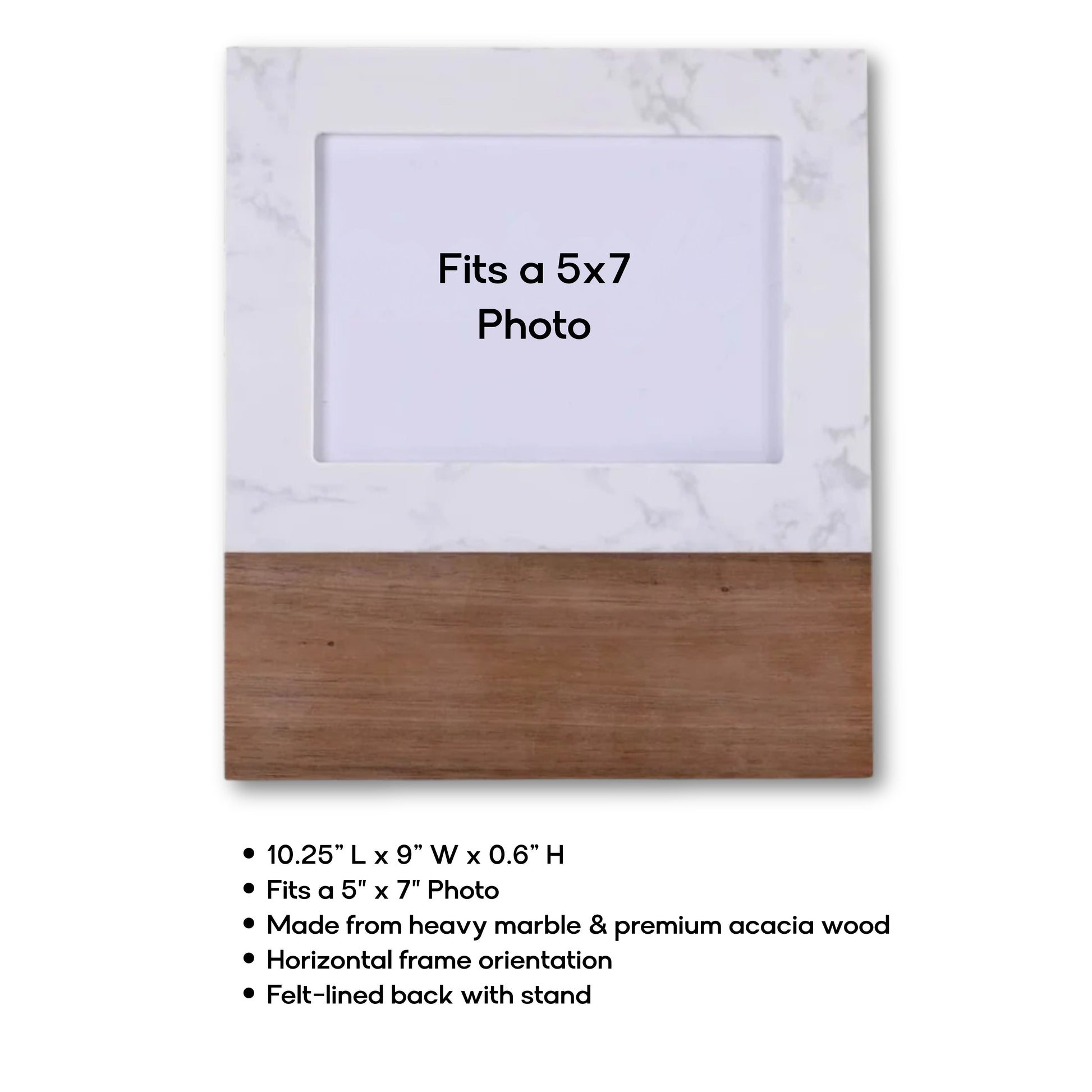 Crafted from heavy natural marble and quality acacia wood, each frame showcases unique wood grain, knots, and color variations—making every piece truly one of a kind. The frame is horizontal, includes a felt-lined back with a sturdy stand, and adds a timeless, elevated touch to shelves, desks, or mantels.