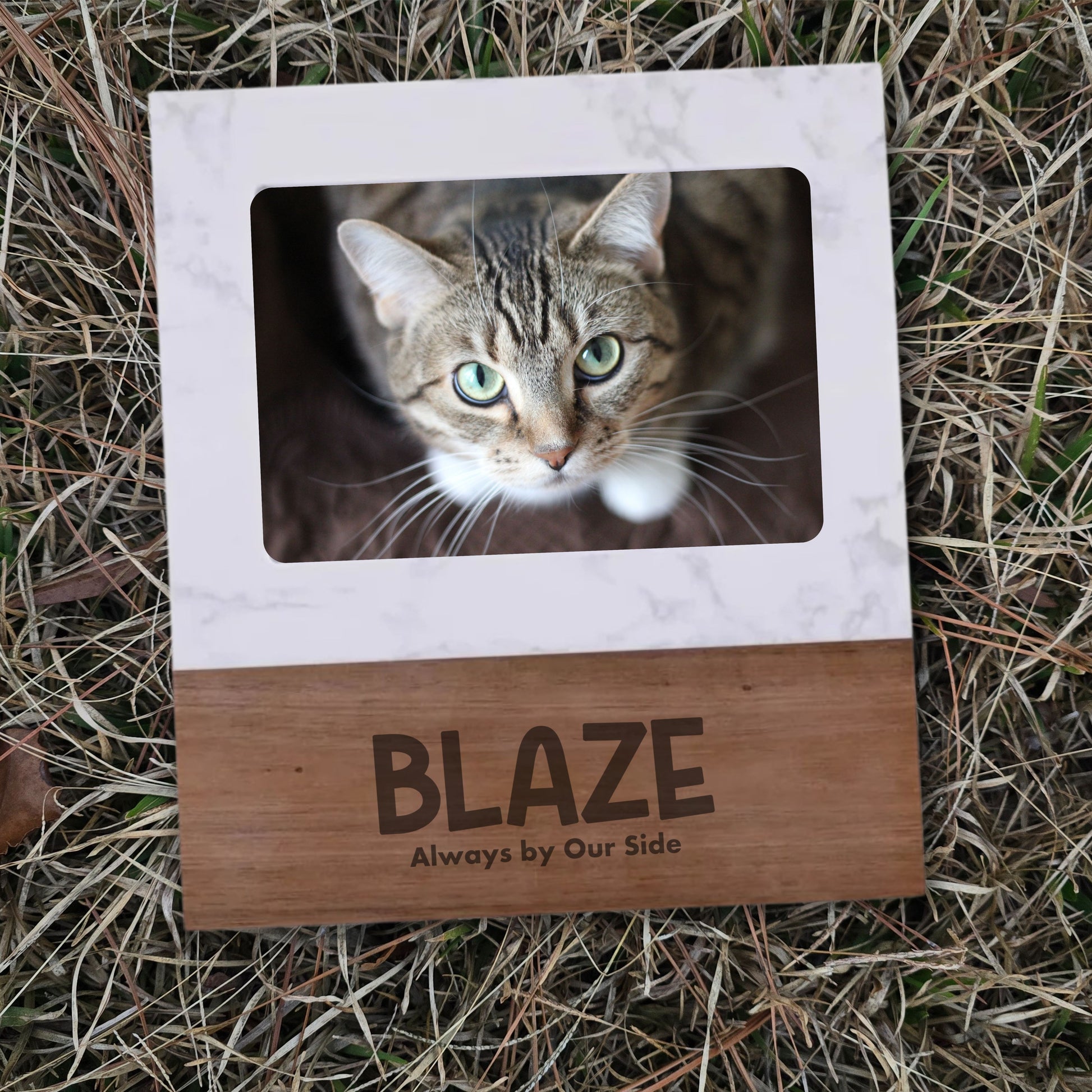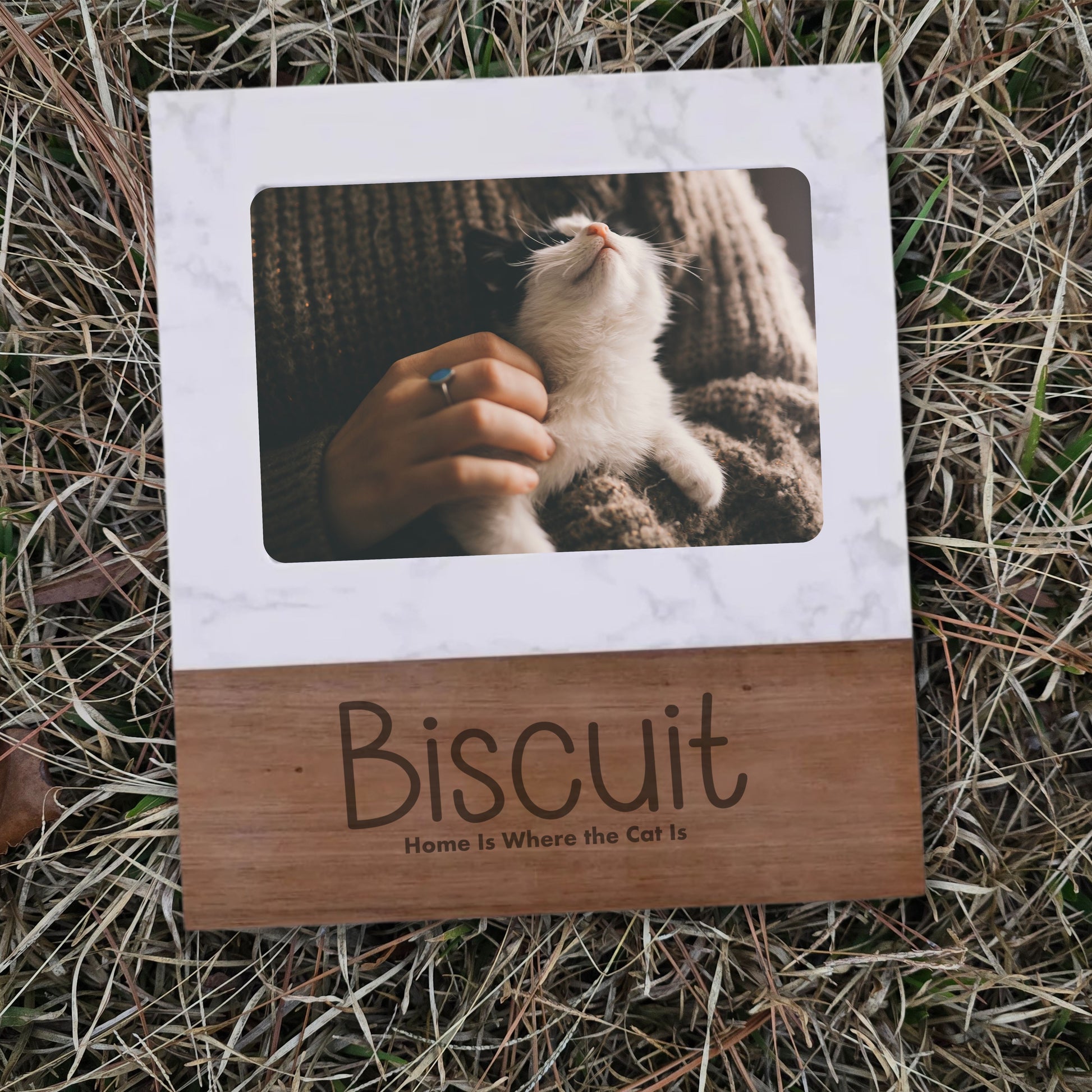 Cherish the cat who turns your house into a home with this personalized marble and acacia wood cat photo frame, designed for cat lovers who treasure every whisker-filled moment. Featuring a heartfelt engraved phrase and your custom details, this frame beautifully displays a 5x7 photo of your beloved cat and makes a meaningful keepsake for everyday décor or thoughtful gifting.