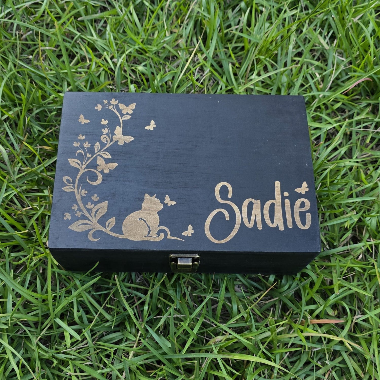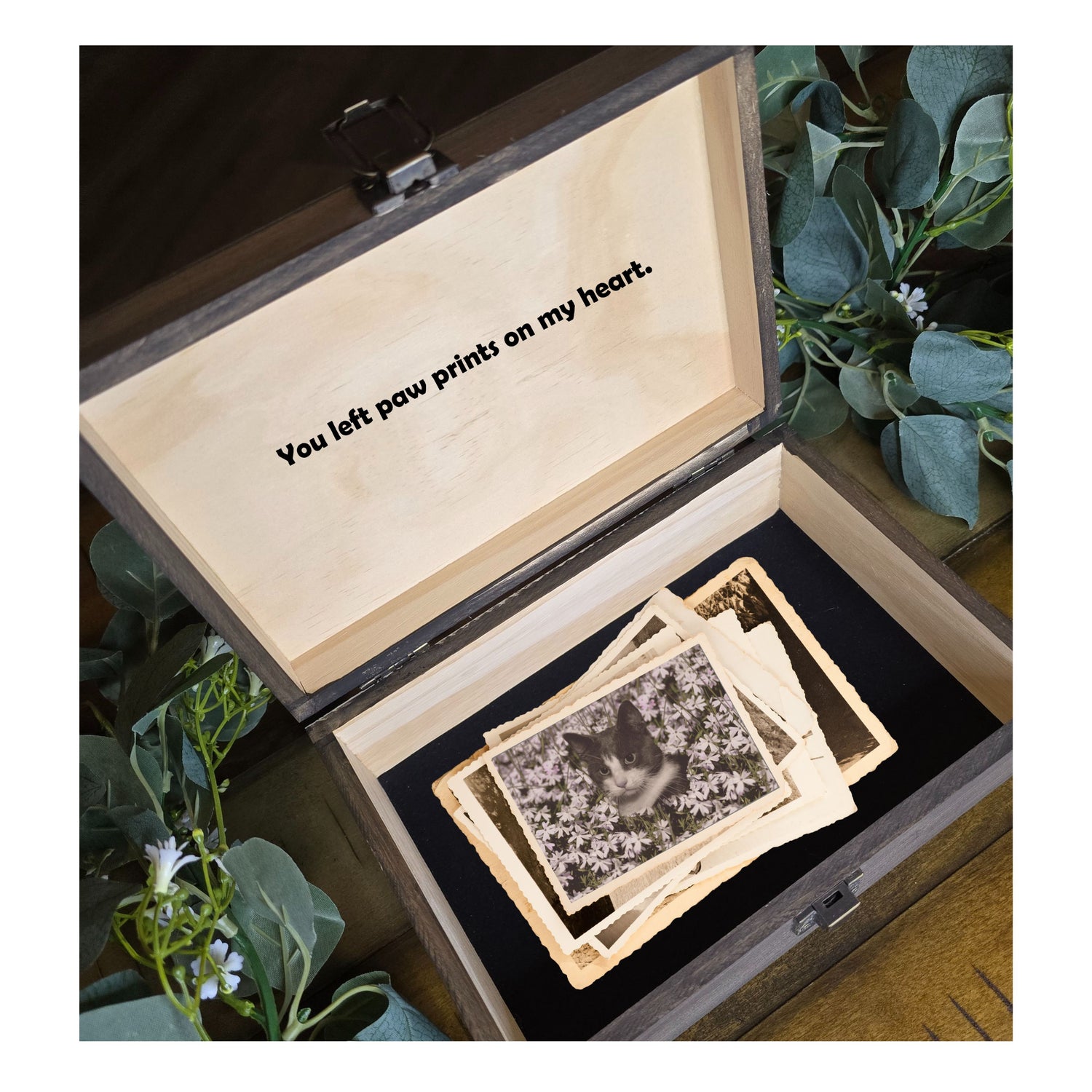 The purr-fect keepsake for the cat lover or a beautiful way to honor the bond you shared with your furry friend. Designed with heartfelt detail, this box can be personalized on the outside with your cat’s name and includes space inside for a custom message, making it a truly unique keepsake.