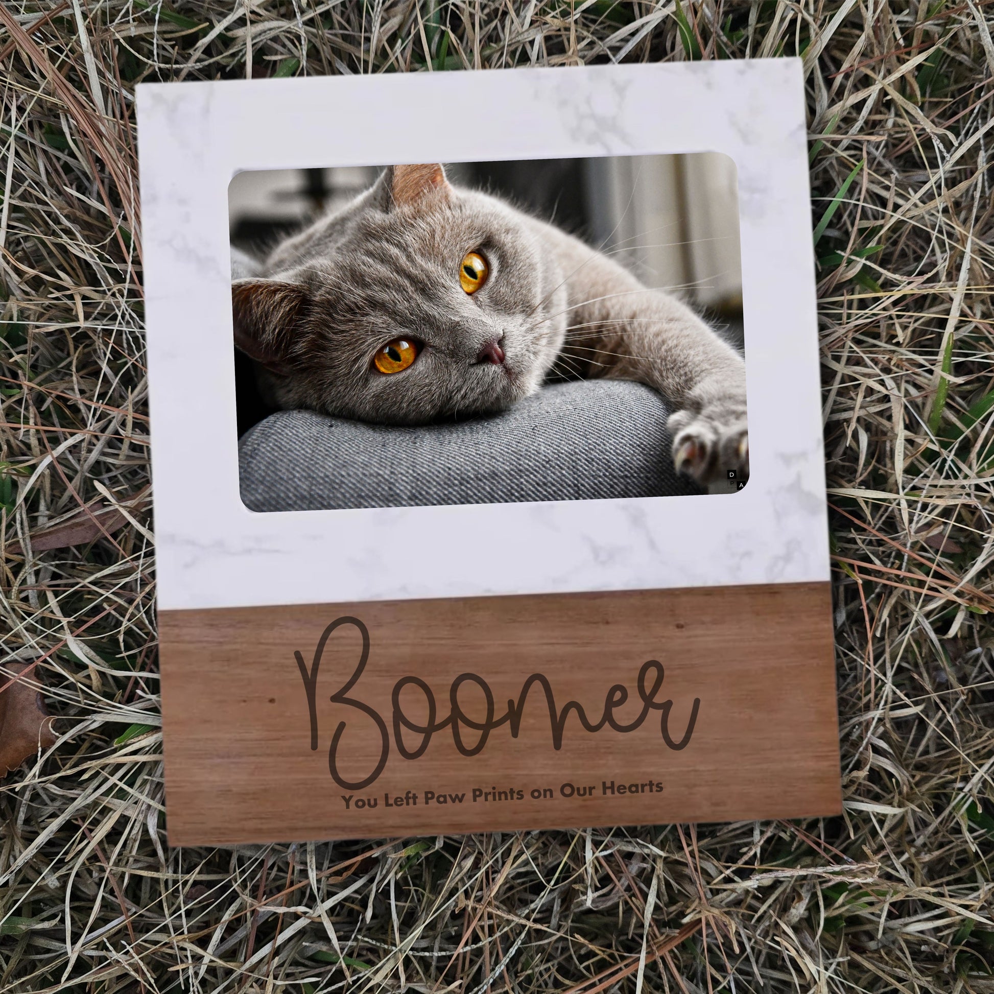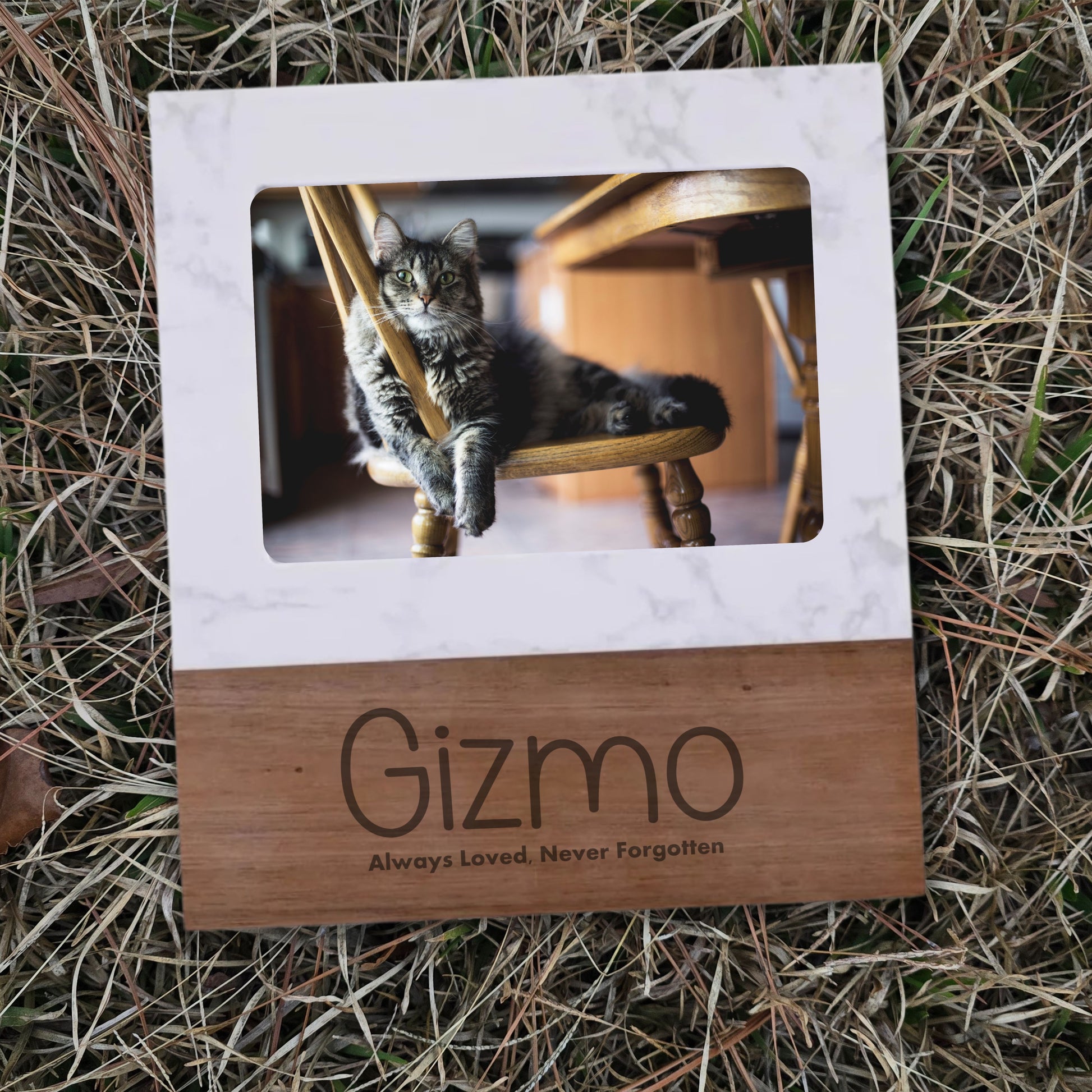 Remembering the heart of the family who turned your house into a home with this personalized marble and acacia wood cat photo frame, designed for cat lovers who treasure every cherished moment with their beloved cat. Featuring a heartfelt engraved phrase and your custom details, this frame beautifully displays a 5x7 photo of your beloved cat and makes a meaningful keepsake for everyday décor or thoughtful gifting.